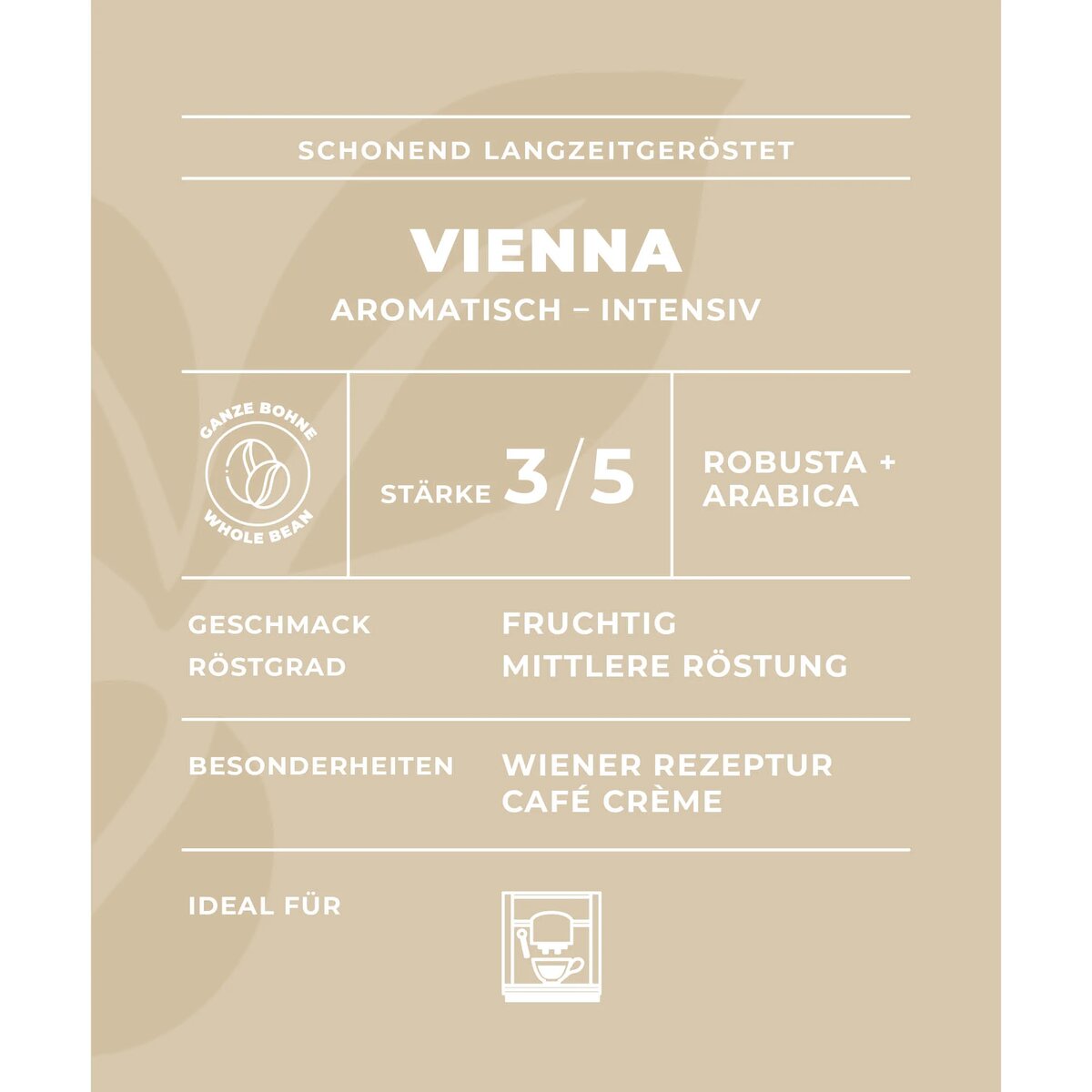 Kräftige Röstiung von Arabica- und Robustabohnen für einen intensivem Aroma und mit leichter Säure.